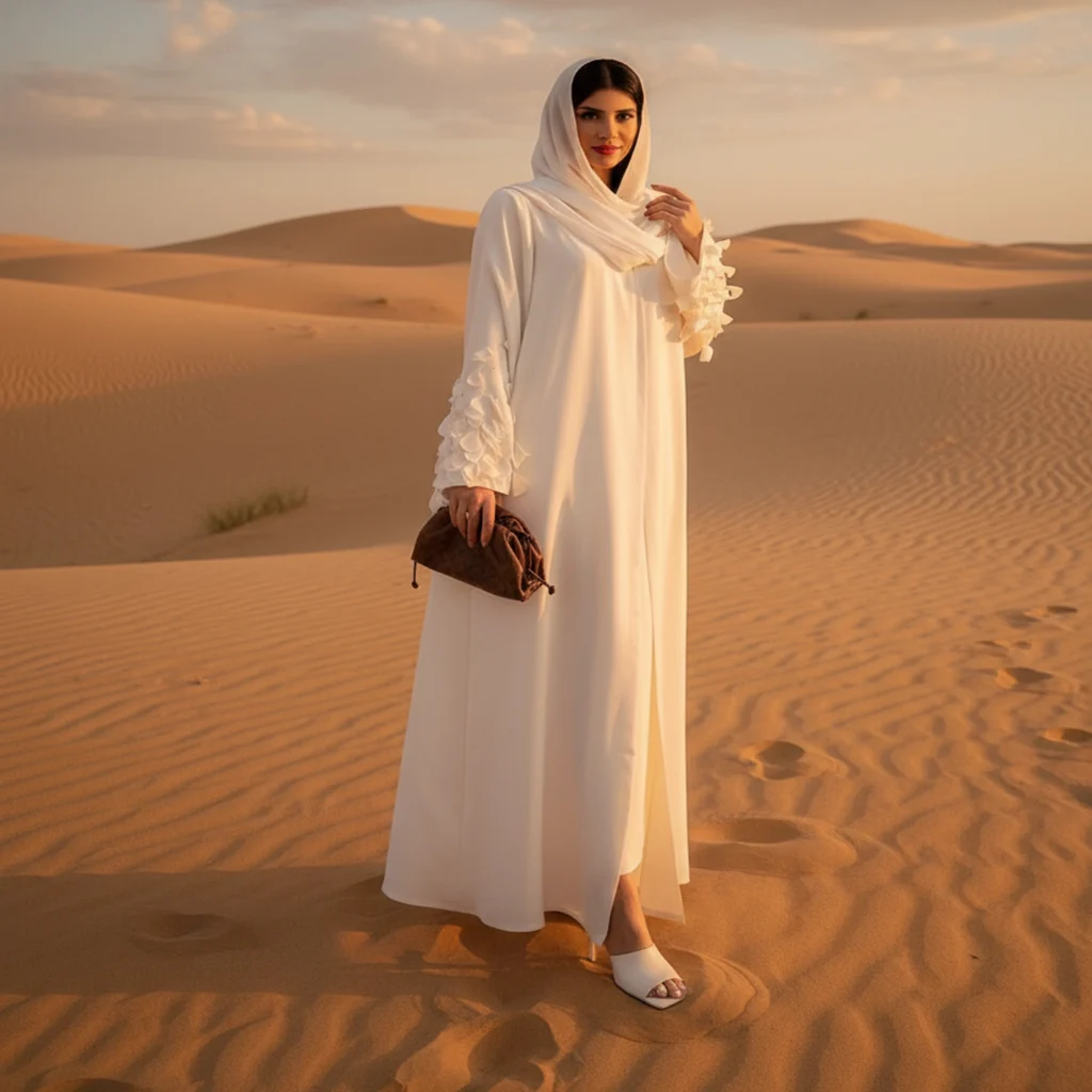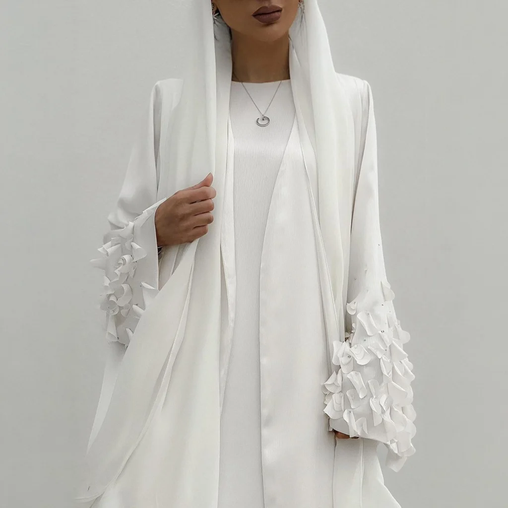 عباية بيضاء راقية بخامة انسيابية وتطريز ناعم ثلاثي الأبعاد على الأكمام يمنحك نعومة وأناقة مثالية للمناسبات والإطلالات الراقية.