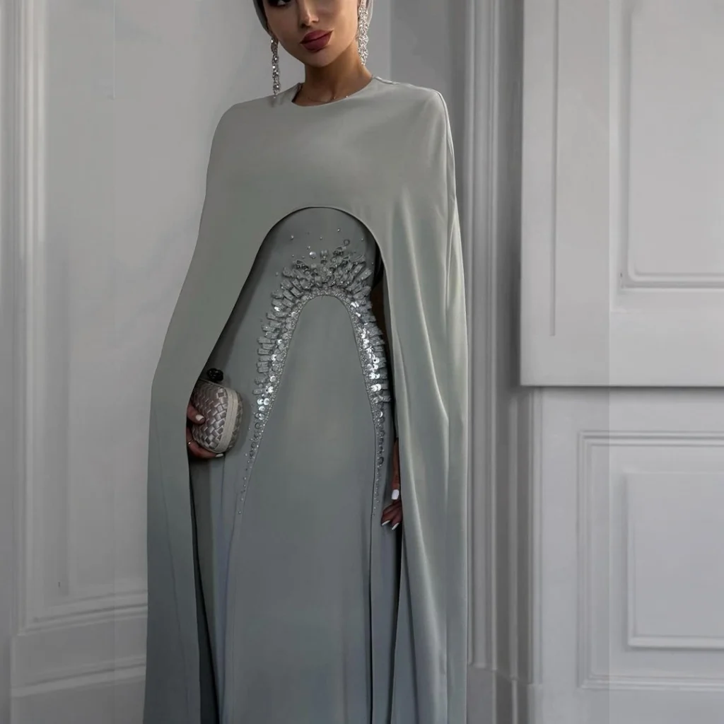 عباية فاخرة بلون رمادي فاتح مع تطريز كريستالي لامع بتصميم قوسي مميز، تمنح إطلالة فخمة وناعمة في آن واحد.